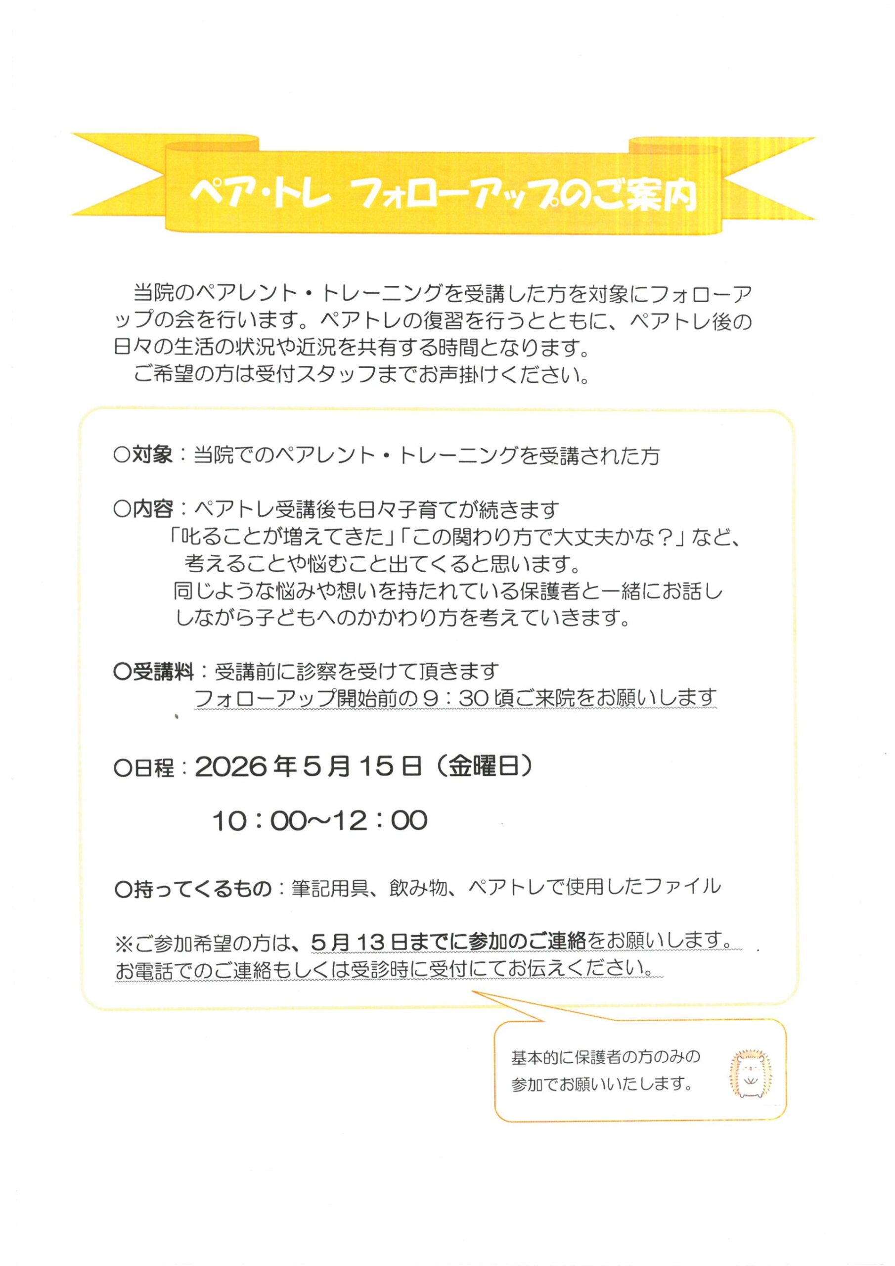 当院のペアレント・トレーニングを受講した方を対象にフォローアップの会を行います。